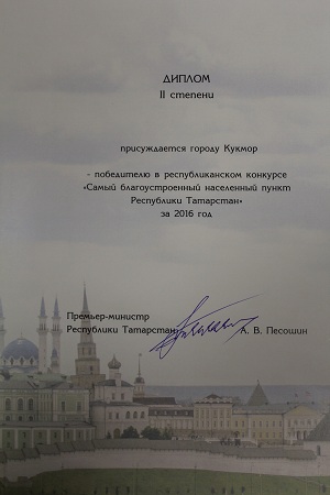 Город Кукмор стал победителем в республиканском конкурсе "Самый благоустроенный населенный пункт Республики Татарстан" за 2016 год, и награжден Дипломом второй степени.