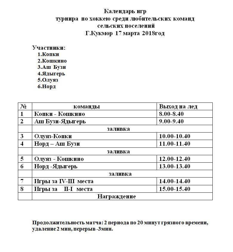 17 марта 2018 года (суббота) состоится турнир по хоккею среди любительских команд сельских поселений.