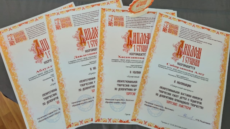 Учащиеся художественного отделения Кукморской детской школы искусств Абдуллина Нелли, Давлетшина Гузель, Сабирзянова Алсу (рук. Низамова Л.Н.) и Хасанзянова Адиля (рук. Гатина Г.И.) заняли почетных четыре 1 места в Межрегиональной выставке- конкурсе творческих работ детей и педагогов по декоративно- прикладному творчеству "Вятские мастера"