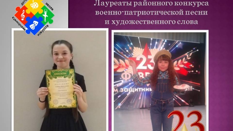18 февраля 2019 года в районном доме культуры состоялся гала-концерт с участием победителей районного конкурса военно-патриотической песни и художественного слова, посвященного Дню защитника Отечества и памяти поэта-героя М.Джалиля, где учащиеся театрального отделения Кукморской детской школы искусств Норматова Ясмина (рук. Ваккасова Р.И.) и Миннегалиева Альфина (рук. Хабибуллина Д.Р.) завоевали Диплом Лауреата 1 степени. Поздравляем!!