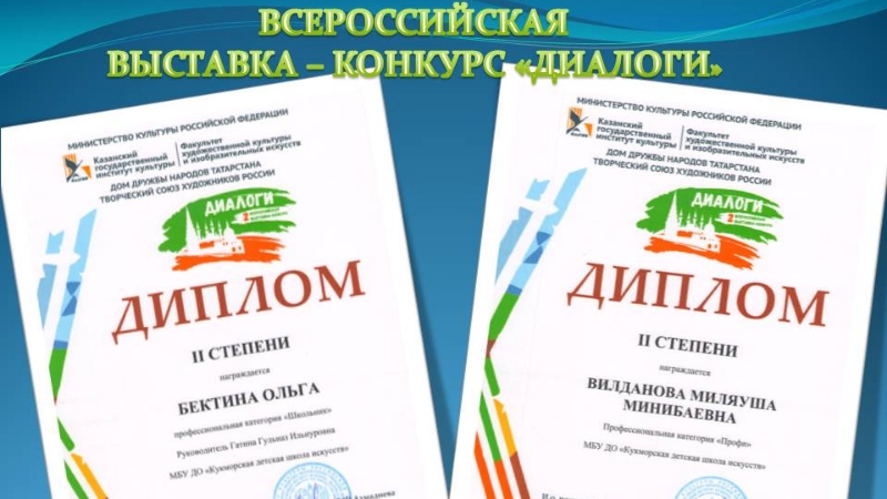 В Казанском государственном институте культуры состоялась Всероссийская выставка- конкурс "Диалоги". В номинации "Профи" преподаватель художественного отделения Кукморской детской школы искусств Вилданова Миляуша Минебаевна была удостоена Диплома 2 степени; учащаяся Бектина Ольга- Диплом 2 степени (рук. Гатина Г.И.)