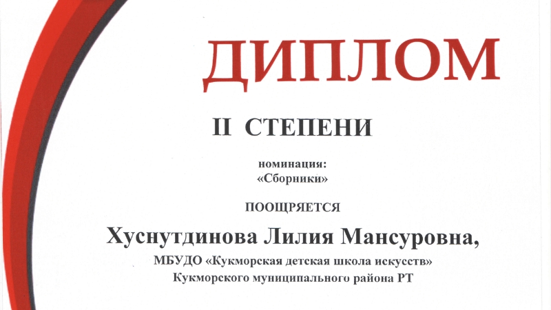 Преподаватель музыкальнорго отделения Кукморской детской школы искусств Хуснутдинова Лилия Мансуровна в номинации "Сборники" Всероссийского конкурса методических разработок педагогов дополнительного образования была удостоена Диплома 2 степени.