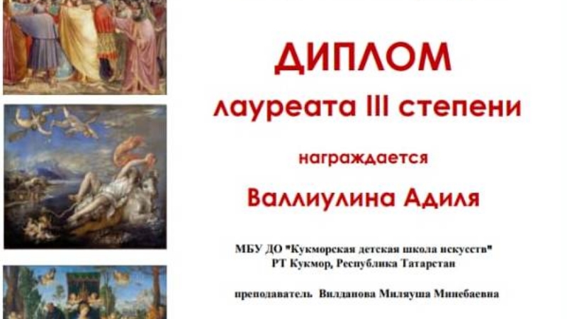 Учащиеся художественного отделения Кукморской детской школы искусств приняли участие во Всероссийской заочной олимпиаде по истории искусств "От Джотто до Дюрера". Валиуллина Аделя- Диплом 3 степени, Давлетшина Гузель- Диплом 3 степени (рук. Вилданова М.М.). Поздравляем победителей.