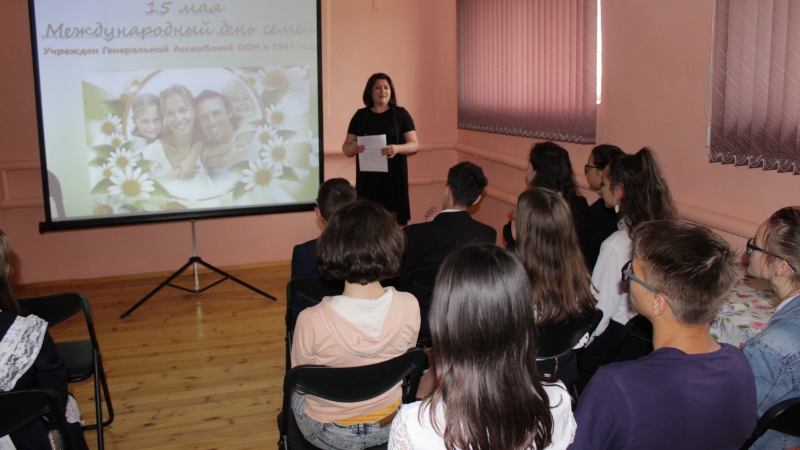 15 мая в центральной библиотеке к Всемирному дню семьи, для учащихся старших классов «Гимназия №1 им. Ч.Т. Айтматова п.г.т. Кукмор», библиотекарь Гарипова Лилия Дамировна провела тематический час с компьютерной презентацией: «В кругу семьи». В начале мероприятия Лилия Дамировна рассказала об истории праздника, о семейном чтении и о том, какую роль играет семья в воспитании человека. Далее участникам мероприятия были предложены различные игры, пословицы, викторины.