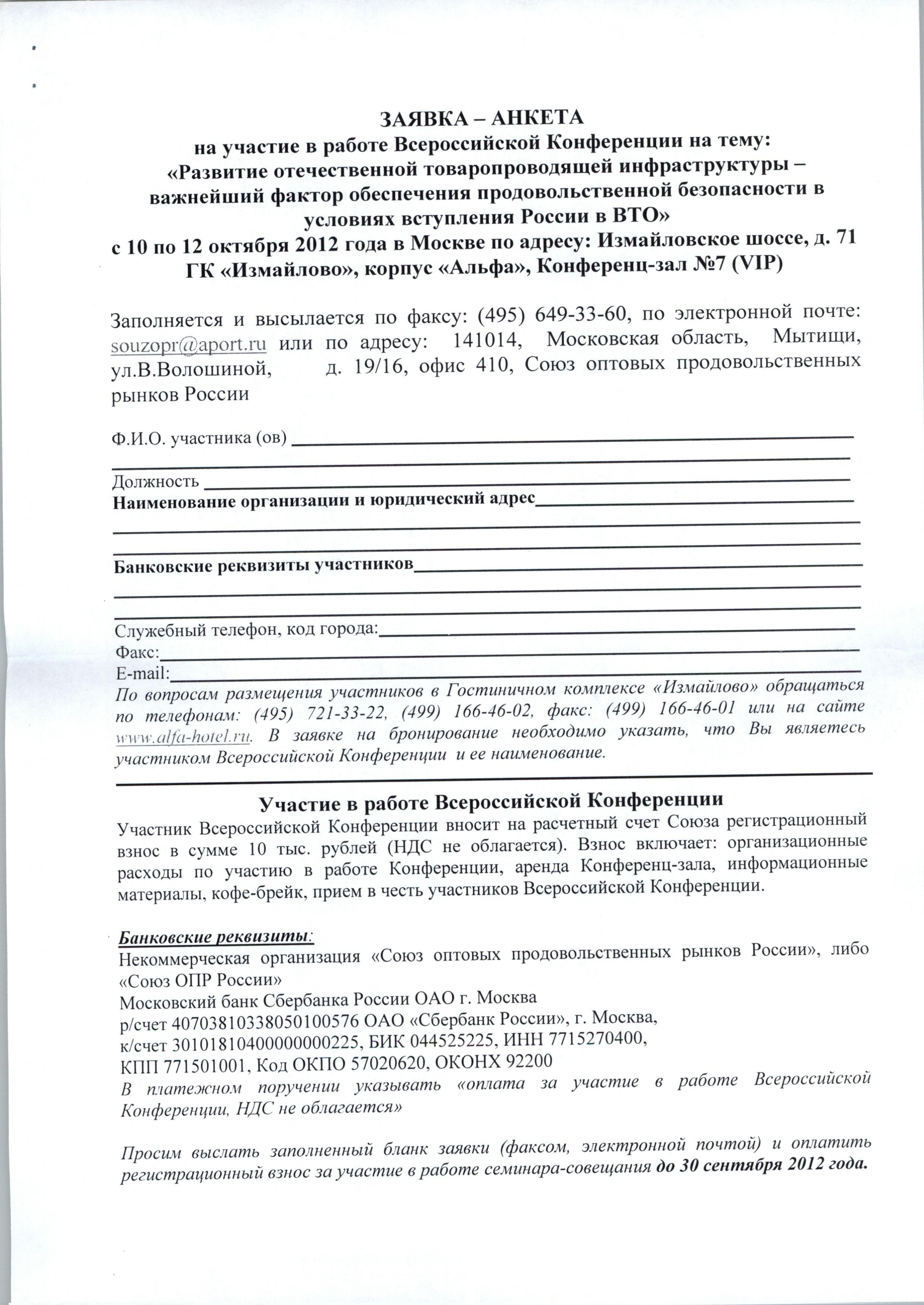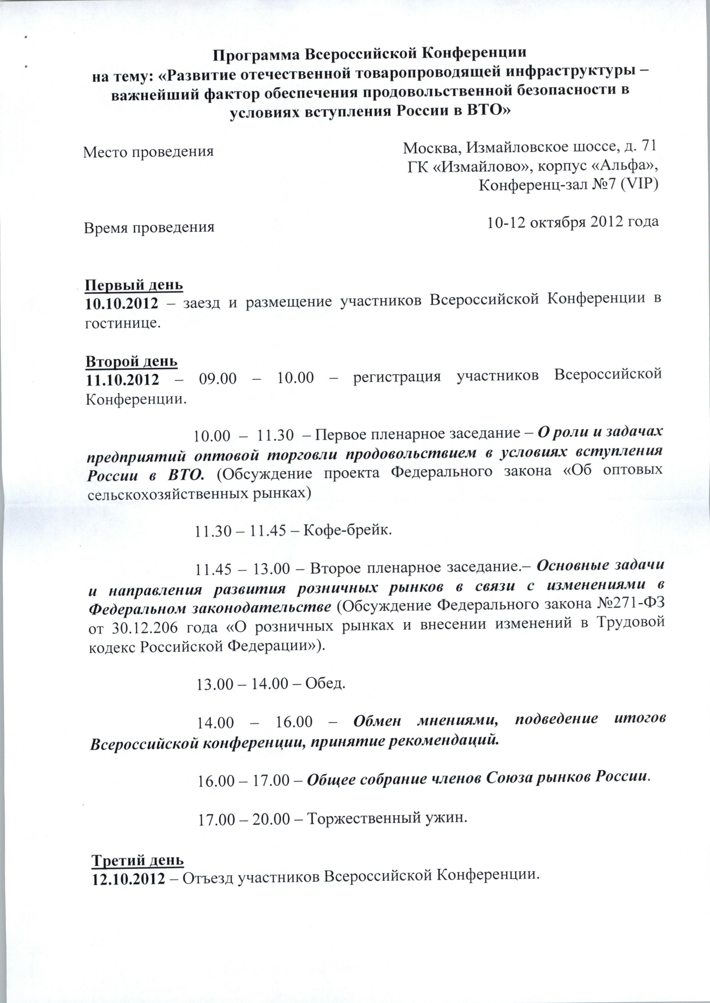 Союз оптовых и продовольственных рынков России с 10 по 12 октября 2012 года в г.Москве по адресу: Измайловское шоссе, д.71, ГК «Измайлово», корпус «Альфа», Конференц-зал №7 проводит Всероссийскую Конференцию на тему» «Развитие отечественной товаропроводящей инфраструктуры – важнейший фактор обеспечения продовольственной безопасности в условиях вступления России в ВТО».