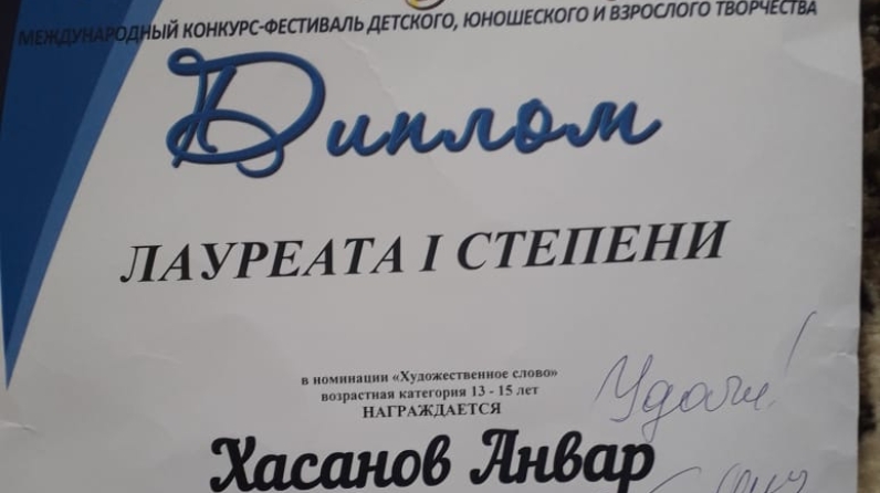 С целью стимулирования развития творчества среди различных возрастных групп, выявления и поддержки новых дарований и культурного обмена между участниками конкурса, с 31 октября по 3 ноября в городе Казань состоялся Международный конкурс-фестиваль детского, юношеского и взрослого творчества «Казань Лучезарная». Конкурс проводился по 7 номинациям. В номинации "Художественное слово" выпускник Кукморской детской школы искусств Хасанов Анвар завоевал Диплом Лауреата 1 степени (рук. Ваккасова Р.И.). Поздравляем победителя и желаем ему дальнейших творческих успехов!