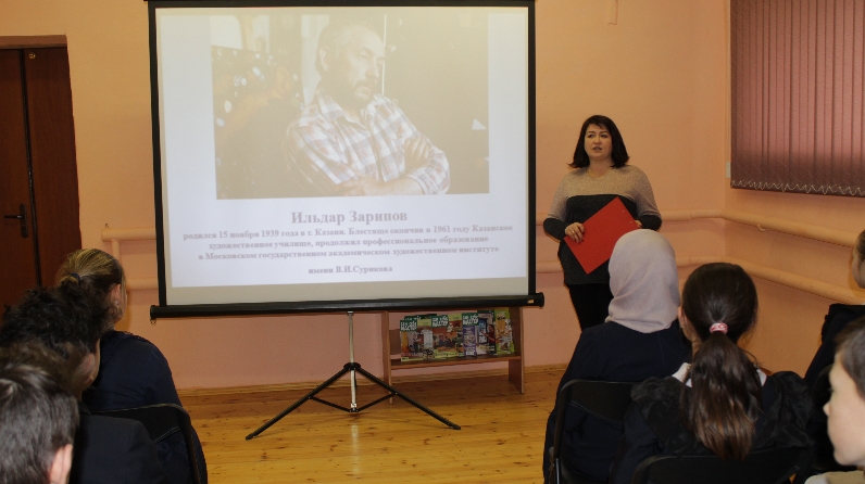 14 ноября главный библиотекарь центральный библиотеки Гарипова Лилия Дамировна, для учащихся 7 класса МБОУ «Гимназия №1 им. Ч.Т. Айтматова п.г.т. Кукмор», провела час искусства с электронной презентацией: «Когда рождается прекрасное». Лилия Дамировна познакомила учащихся с творчеством художника Ильдара Зарипова, рассказала о его биографии и особенностях его картин.