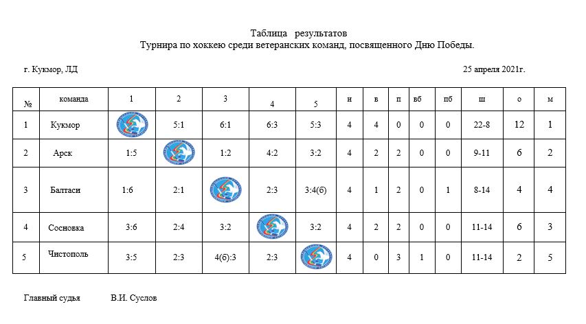 В преддверии празднования Дня Победы 25 апреля 2021 года в ледовом дворце прошел традиционный турнир по хоккею среди ветеранских команд. В турнире приняли участие 5 команд: Кукмор, Арск, Балтаси, Сосновка, Чистополь. По результатам игр третье место заняла команда Сосновка, второе место - Арск , первое место - Кукмор . В номинации «Лучший игрок» был признан Айрат Насыров. Представитель Федерации хоккея Республики Татарстан Владимир Суслов и начальник УДМС Ильсур Кашапов поздравили призеров с победой и пожелали успехов.
