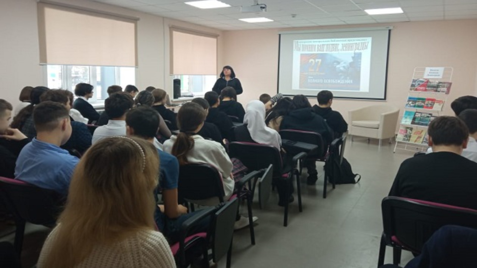 27 января для учащихся 9-х классов средней школы №4, библиотекарь отдела обслуживания Гарипова Л.Д., провела час памяти: “Мы помним Ваш подвиг, Ленинградцы”. Ведущая рассказала ребятам о тяжелых испытаниях, выпавших на долю жителей осажденного закрытого города Ленинграда: о голоде и холоде, о детях и женщинах, работавших наравне с мужчинами на заводах, о защите и обороне Ленинграда советскими солдатами.