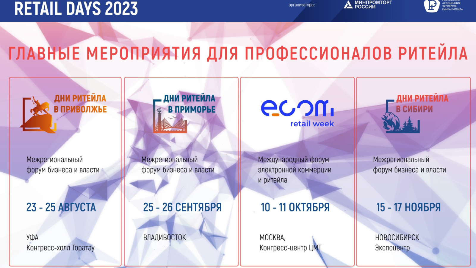 Минпромторг России и Российская Ассоциация экспертов рынка ритейла продолжают серию межрегиональных ритейл-мероприятий. Форум «Дни Ритейла в Приволжье», организованный совместно с Правительством Республики Башкортостан, станет вторым мероприятием в 2023 году и пройдет с 23 по 25 августа в г. Уфе.