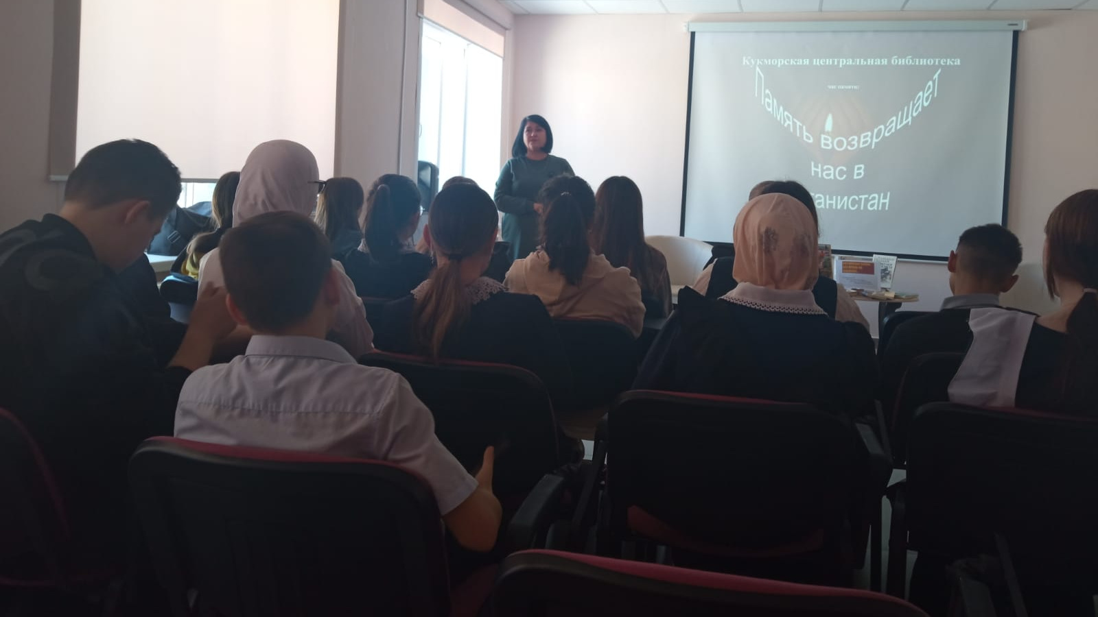15 февраля в центральной библиотеке, для учащихся 8б класса гимназии №1 им.Ч.Т.Айтматова(классный руководитель Галлямова А.М.), главный библиотекарь Гарипова Лилия Дамировна подготовила и провела час памяти с электронной презентацией: «Память возвращает нас в Афганистан». Лилия Дамировна рассказала об истории Афганской войны, которая десять лет была болью целой большой страны, познакомила с книгой “Памяти достойны...”, которая посвящается воинам-интернационалистам Кукморского района Республики Татарстан.