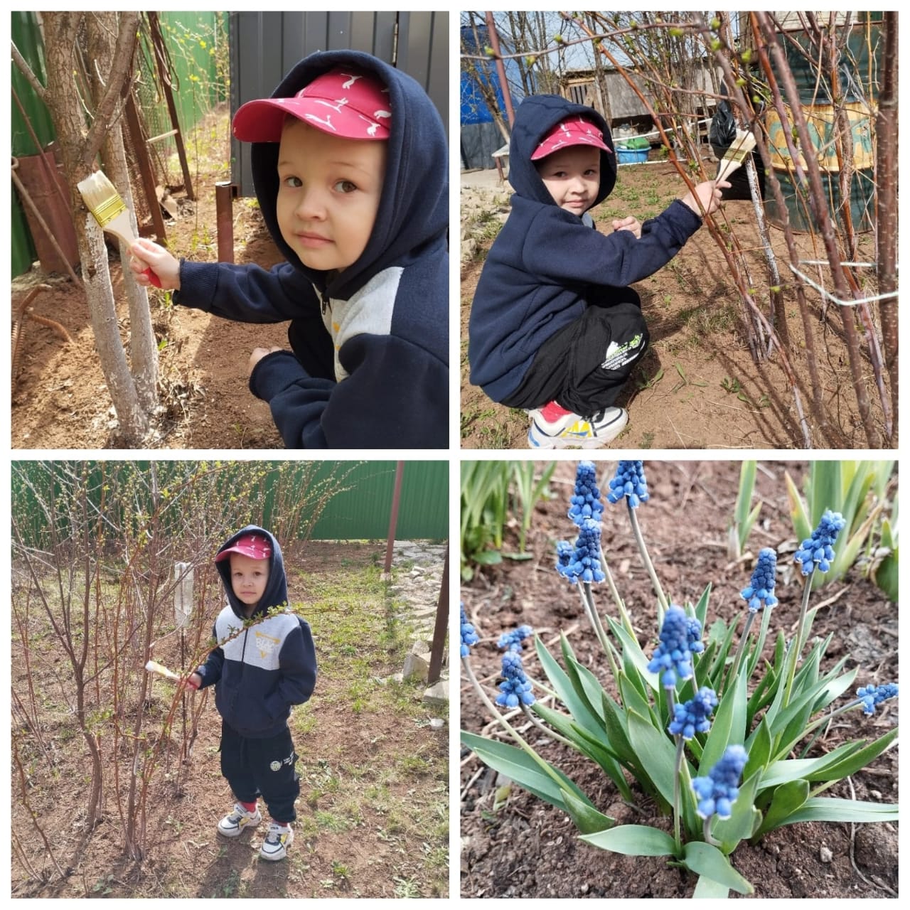 Воспитанник старшей группы МБДОУ Ромашка г. Кукмор Сабитов Роман помогает маме побелить ствол деревьев. В ходе работы наблюдает за красивыми цветами весны. #эковесна #эковесна2025