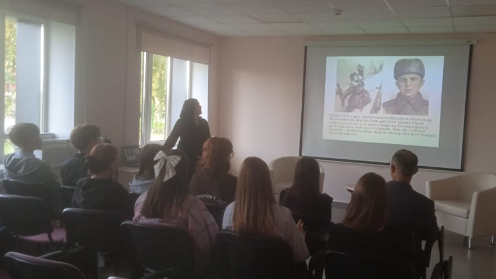 11 сентября библиотекарь отдела обслуживания Гарипова Л.Д., в рамках проекта “Пушкинская карта”, для учащихся 10 класса гимназии №1 им.Ч.Т.Айтматова провела патриотический час: «Бессмертный подвиг Александра Матросова». Мероприятие было посвящено героизму и самопожертвованию советского солдата, Александра Матросова, ставшего символом мужества и отваги в годы Великой Отечественной войны.