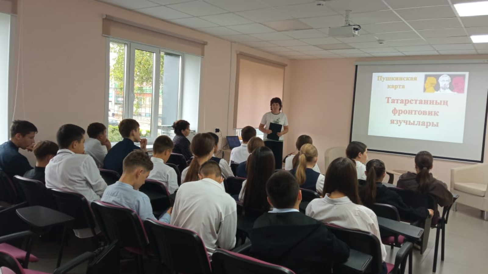 17 сентября библиотекарь отдела обслуживания Саттарова Л.Р., в рамках проекта «Пушкинская карта», для учащихся 8 «а» класса гимназии №1 им. Ч.Т. Айтматова провела литературный час: «Писатели фронтовики Татарстана».