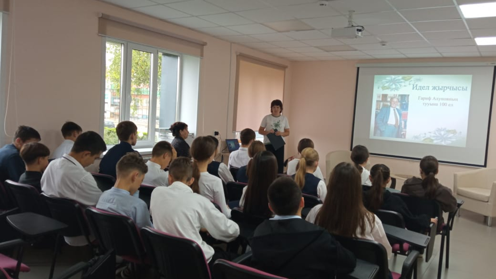 18 сентября библиотекарь отдела обслуживания Саттарова Л.Р., для учащихся 8 «а» класса, гимназии №1 им. Ч.Т.Айтматова провела литературный час: «Волжский певец», посвященный 100 летию со дня рождения татарского писателя Г.Ахунова.