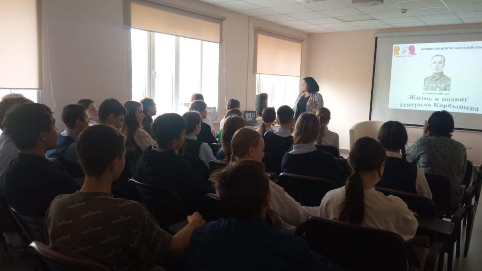 10 октября библиотекарь отдела обслуживания Гарипова Л.Д., в рамках проекта “Пушкинская карта”, для учащихся 8 “а” класса средней школы №4, провела исторический час: “Жизнь и подвиг генерала Карбышева”. Библиотекарь начала мероприятие с краткого рассказа о биографии Карбышева, подчеркнув его исключительные способности в инженерном деле и его вклад в укрепление обороноспособности страны. Особое внимание было уделено периоду Великой Отечественной войны, когда генерал Карбышев, попав в фашистский плен, проявил несгибаемую волю и верность Родине.