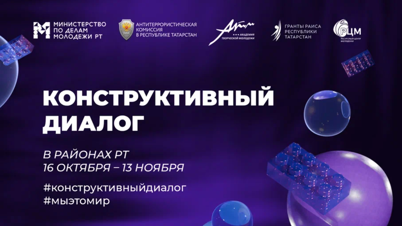 Региональной общественной организацией «Академия творческой молодежи Республики Татарстан» при координирующей роли аппарата антитеррористической комиссии в Республике Татарстан, при содействии Министерства образования и науки Республики Татарстан и Министерства по делам молодежи Республики Татарстан 13 ноября 2025 года проводится выездное мероприятие «Конструктивный диалог».