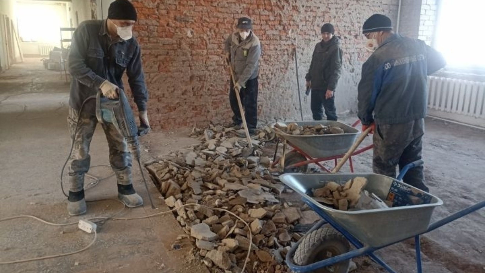 «Мы полностью снимаем старую плитку со стен, выравнивающие слои с полов, также убираем некоторые перегородки в палатах, старый линолеум и электропроводку, — продолжает прораб. — В бригаде 24 человека. Все они — опытные, неоднократно проверенные в деле специалисты с многолетним стажем в строительстве. Поэтому мы уверены в качестве. Работы будут выполнены на совесть и в установленные сроки».