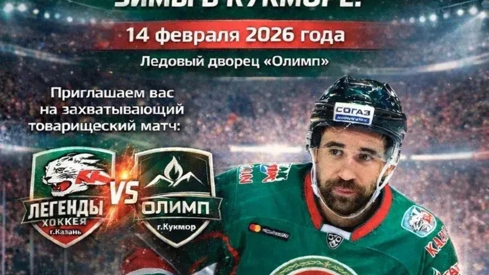 14 февраля 2026 года в Ледовом дворце «Олимп» нас ждёт настоящий хоккейный праздник — товарищеский матч между ОЛИМП (Кукмор) VS ЛЕГЕНДЫ ХОККЕЯ (г. Казань).