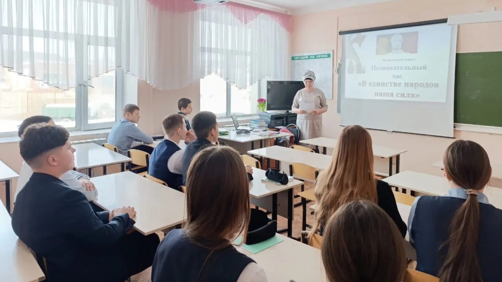 13 марта в Кукморской Центральной библиотеке в рамках Пушкинской карты библиотекарь Саттарова Лилия Раисовна провела познавательный час: “В единстве народов наша сила” для учащихся 9 “Б” класса гимназии №1 им.Ч. Т. Айтматова.