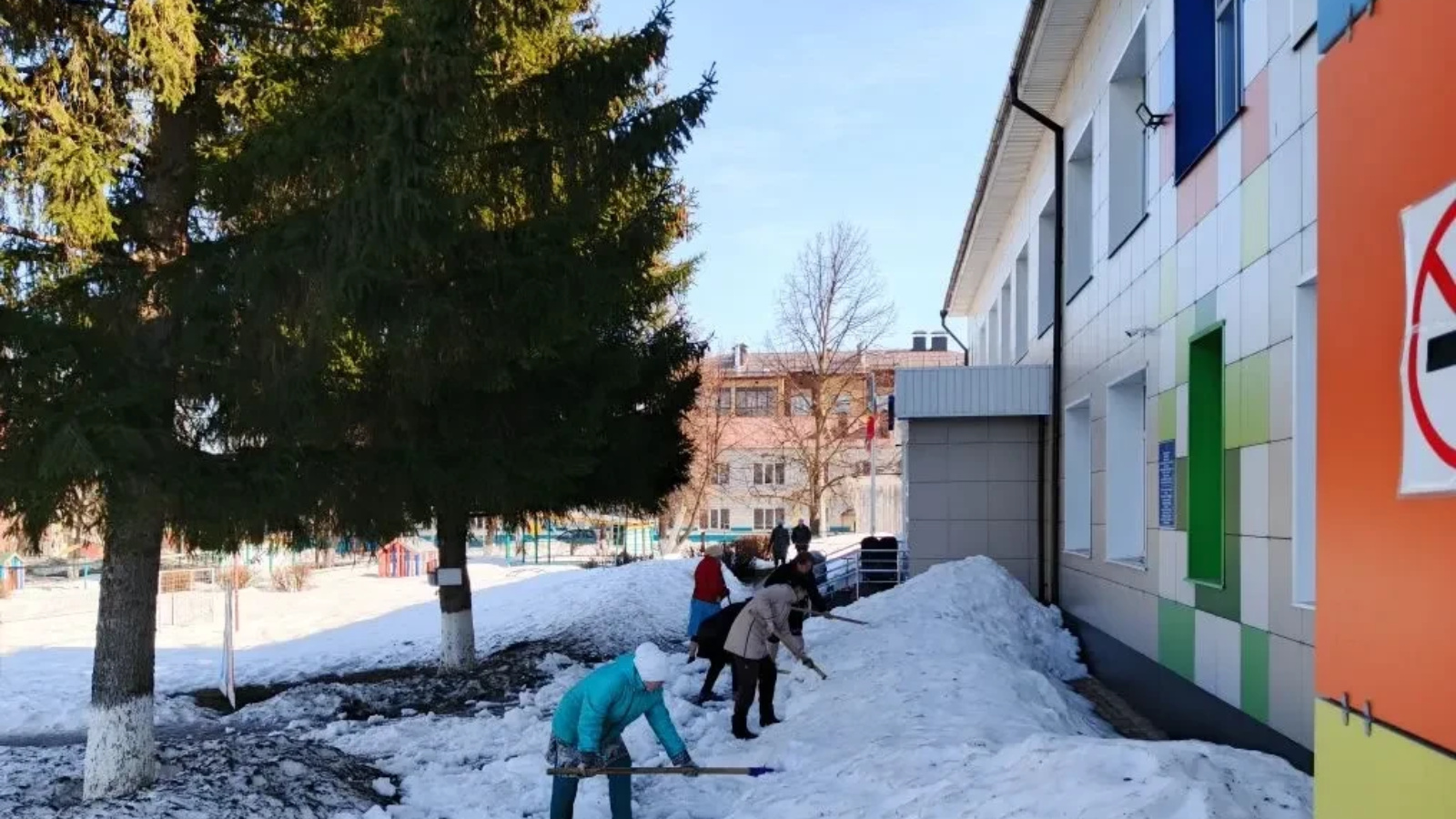 Сегодня, 31 марта 2026 года работники детского сада «Ручеек» устроили первый этой весной субботник — раскидали снег на территории.