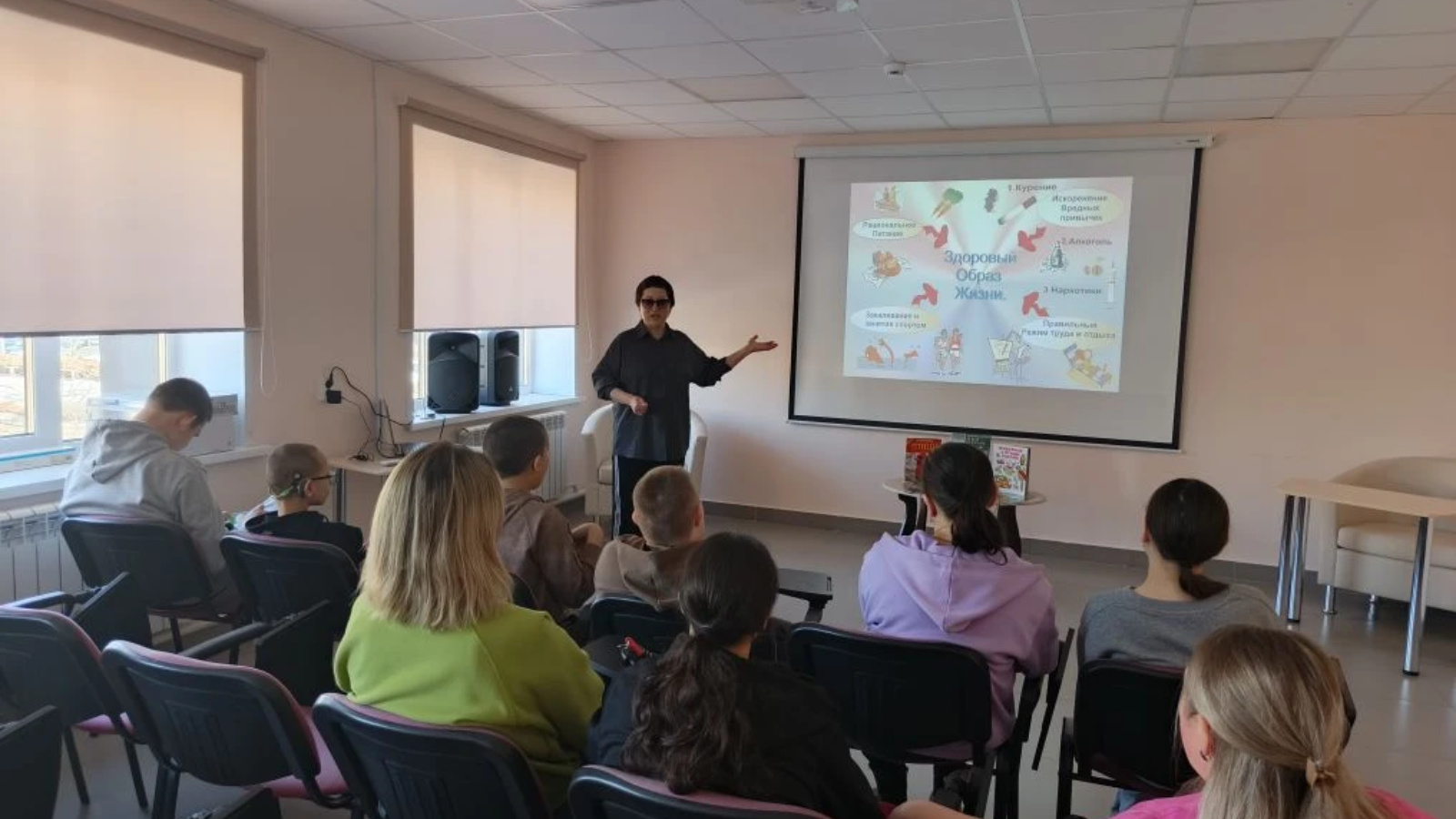 7 апреля библиотекарь читального зала Загидуллина Г.Ф., для ребят, проходящих реабилитацию в центре “Милосердие”, провела тематический час: «Будь здоров на сто годов».