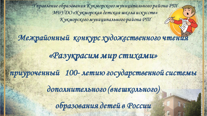 2018 елның 22-23 ноябрендә Кукмара шәһәрендә Россиядә Балаларга өстәмә (мәктәптән тыш) белем бирүнең дәүләт системасына 100 ел тулуга багышланган "Разукрасим мир стихами" дип аталган I районара рәсем конкурсы узды. Конкурсны Татарстан Республикасы Кукмара муниципаль районы мәгариф идарәсе һәм Кукмара муниципаль районының "Кукмара балалар сәнгать мәктәбе" муниципаль бюджет белем бирү учреждениесе оештырды. Конкурста катнашуга өстәмә белем бирү учреждениеләре, гомуми белем бирү учреждениеләре укучылары, 6 яшьтән алып 15 яшькә кадәрге балалар чакырылган иде. Чарада Кукмара, Саба, Балтач, Арча, Мамадыш һәм Нократ Аланы районнарыннан барлыгы 150гә якын укучы катнашты.