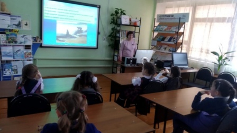 8 февральдә балалар китапханәсе хезмәткәре Хафизова Гөлфия 4нче номерлы мәктәпнең 2а сыйныф укучылары өчен «Обитатели морских глубин» дип исемләнгән экологик дәрес уздырды. Дәрес барышында балалар диңгездә яшәүче җан ияләре турында кызыклы мәгълүматлар тыңлады, күргәзмәгә куелга китаплар белән танышты. Алган белемнәрен укучылар “Искиткеч китлар” дигән тест ярдәмендә тикшерде. Дәрес азагында балалар китлар турында видеофильм һәм мультфильм карады.