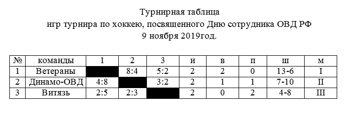 2019 елның 9 ноябрендә Кукмара шәһәре «Олимп» Боз сараенда РФ Эчке эшләр органнары хезмәткәрләре көненә багышланган хоккей буенча традицион турнир узды. Турнирда Кукмара шәһәренең «Ветераннар», Кукмара шәһәренең «Динамо-ОВД», Сосновканың «Витязь» командалары катнашты. Турнирның мактаулы кунаклары арасында Кукмара муниципаль районы башлыгы Димитриев Сергей Димитрий улы, Россия Эчке эшләр министрлыгының Кукмара районы буенча бүлеге начальнигы Нургалиев Рамил Ришат улы, Кукмара район прокуроры Шакиров Ришат Наил улы бар иде.