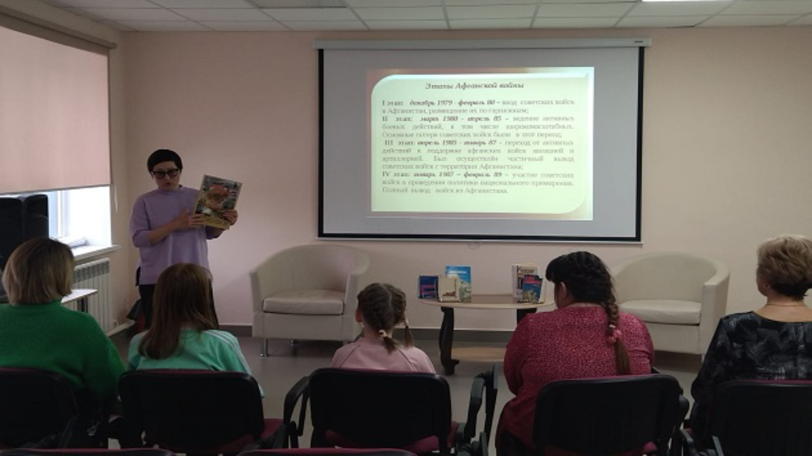 16 февраль көнне Үзәк китапханәнең уку залы китапханәчесе Загидуллина Гөлнара Фәрит кызы “Шәфкать” үзәгендә тернәкләнү узучы балалар өчен «Батырлык исеме-Әфганстан» дигән әңгәмә үткәрде. Чара барышында Гөлнара Фәритовна Россия хәрби тарихының иң фаҗигале сәхифәләренең берсе – Әфган сугышы тарихы турында сөйләде. Чарада катнашучылар компьютер презентациясе һәм китап күргәзмәсе белән таныштылар.