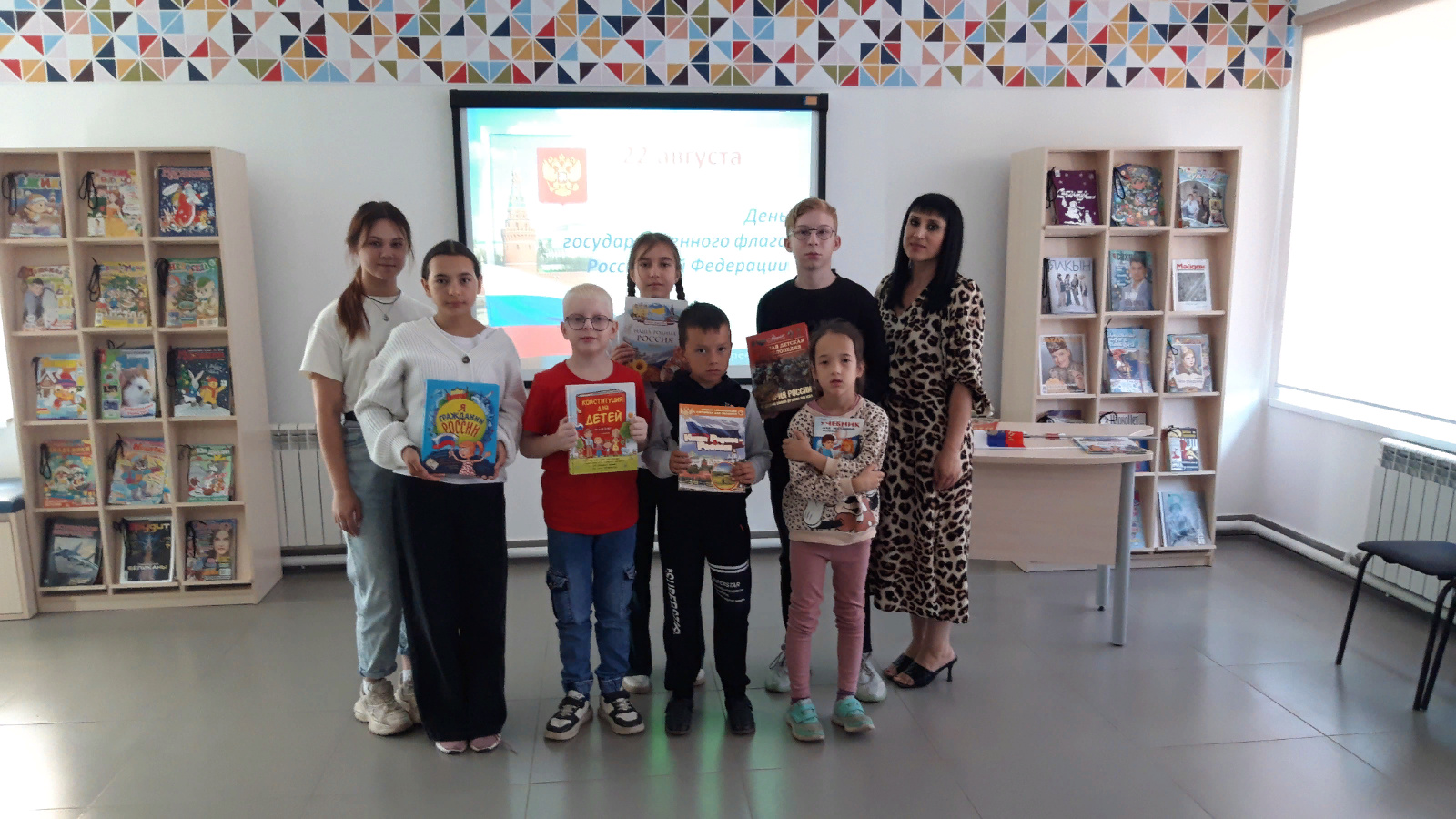 С.В.Михалков исемендәге үзәк балалар китапханәсендә, “Шәфкатьлелек” реабилитация үзәгенә йөрүче балалар өчен, китапханәче Ләйсән Әхмәтова Россия Дәүләт флагы тарихы буенча “Россия флагы дәүләт горурлыгы” дигән танып белү сәяхәте үткәрде. Ул балаларга Россия флагы барлыкка килү тарихы, өч төснең нәрсә аңлатуы һәм флагның нинди очракларда күтәрелүе турында сөйләде. Чарада флаг һәм Россия турында шигырьләр, Ватан турында мәкальләр яңгырады. Балалар «Россиянең Дәүләт символикасы» викторинасы сорауларына җавап бирде. Чара китапларга күзәтү белән тәмамланды.