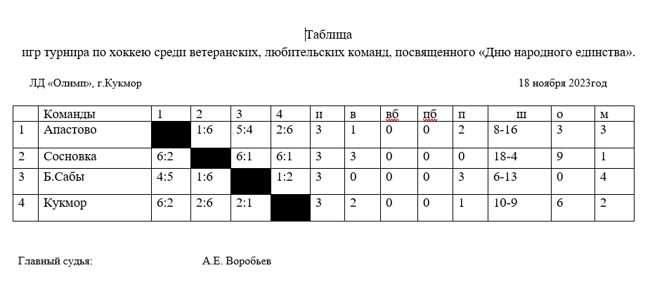 2023 елның 18 ноябрендә ветераннар командалары арасында Халыклар бердәмлеге көненә багышланган хоккей буенча турнир узды. Турнирда 4 команда катнашты: Апастово, Б.Сабасы, Сосновка, Кукмора. Уеннар нәтиҗәләре буенча «Кукмара районы ветераннары» командасы 2 урынны алды. «Иң яхшы яклаучы» номинациясендә Айрат Сәйфетдинов танылды.