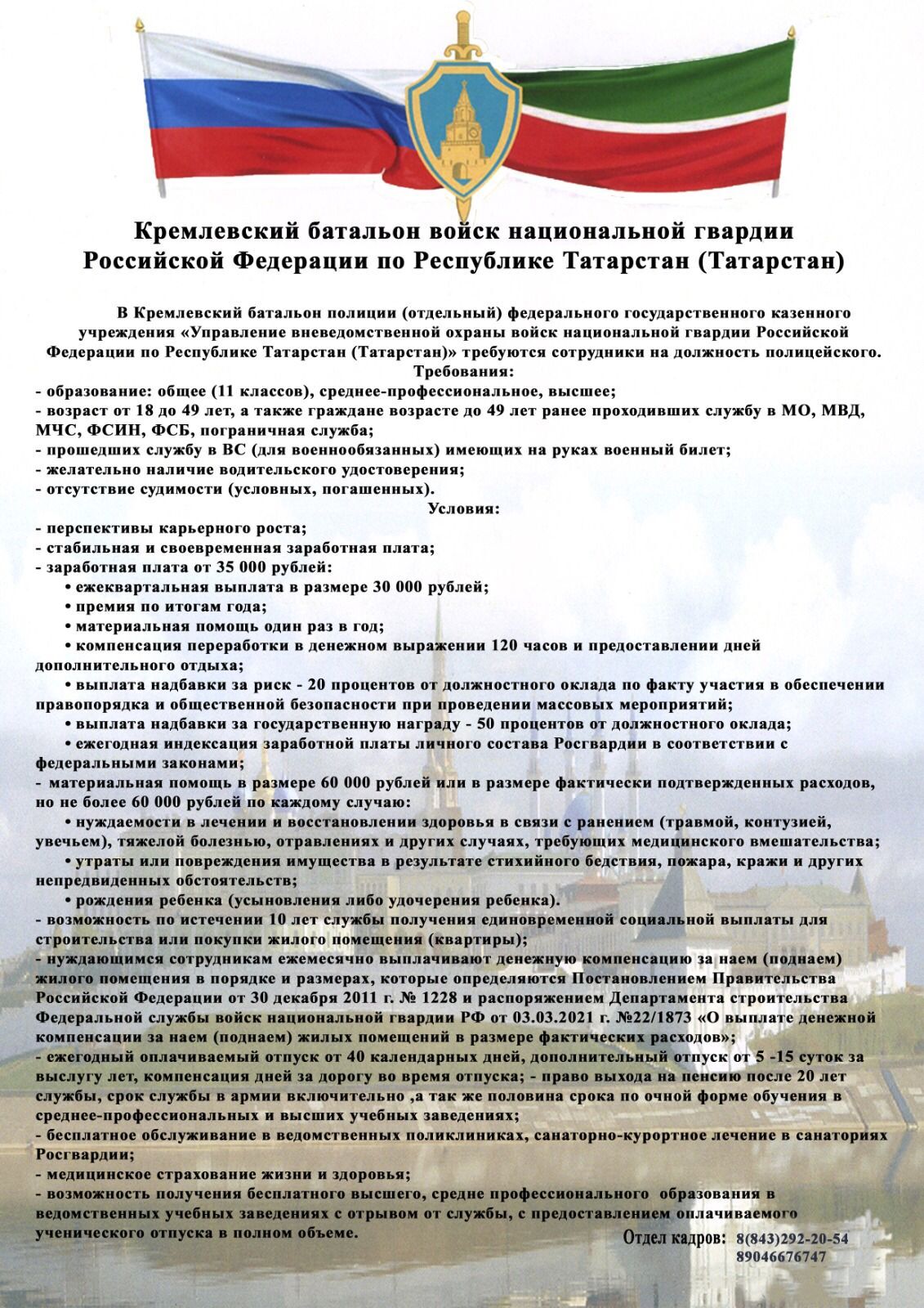 Хәзерге вакытта «Татарстан Республикасы буенча Россия Федерациясе Милли гвардиясе гаскәрләрен ведомстводан тыш саклау идарәсе» Федераль дәүләт казна учреждениесенең Кремль полиция батальоны (аерым) полиция хезмәткәре вазифасында хезмәт итү өчен кандидатлар сайлап ала. Кремль батальоны Татарстан Республикасының мөһим дәүләт объектларын саклый, Татарстан Республикасы һәм Россия Федерациясе югары вазифалы затларының, чит ил дәүләтләре делегацияләренең турыдан-туры булган урыннарында үткәрү режимын гамәлгә ашыра, иминлекне һәм җәмәгать тәртибен саклауны тәэмин итә.