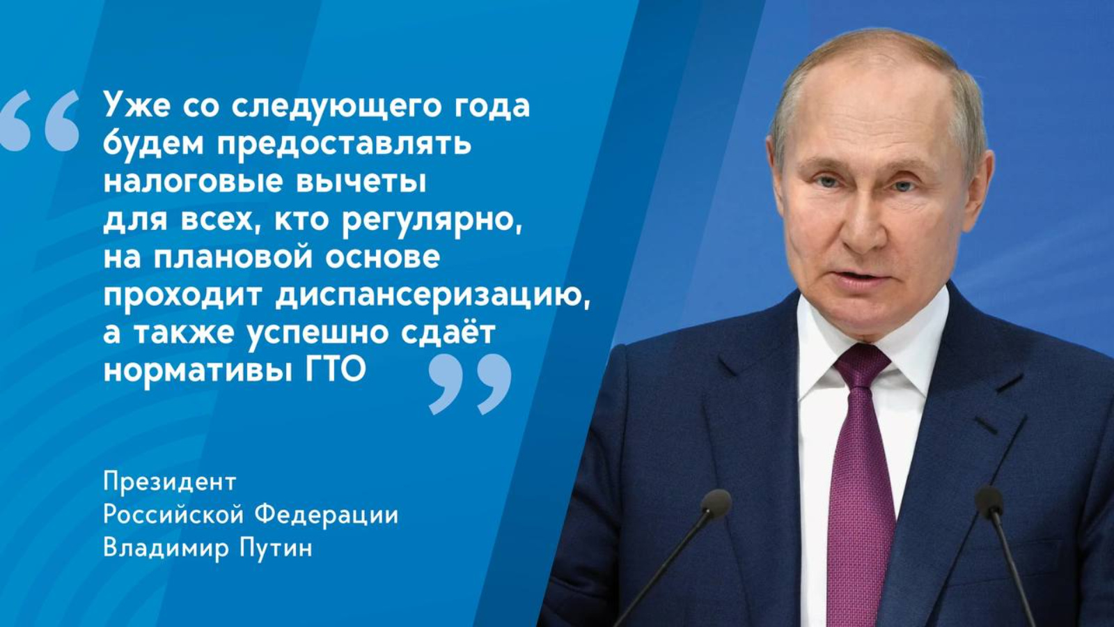 Киләсе елдан планлы нигездә диспансеризация узучы һәм ГТО нормативларын үтәүче һәркемгә салым ташламасы биреләчәк, диде РФ Президенты Владимир Путин Федераль Җыенга Юллама белән чыгыш ясаганда.