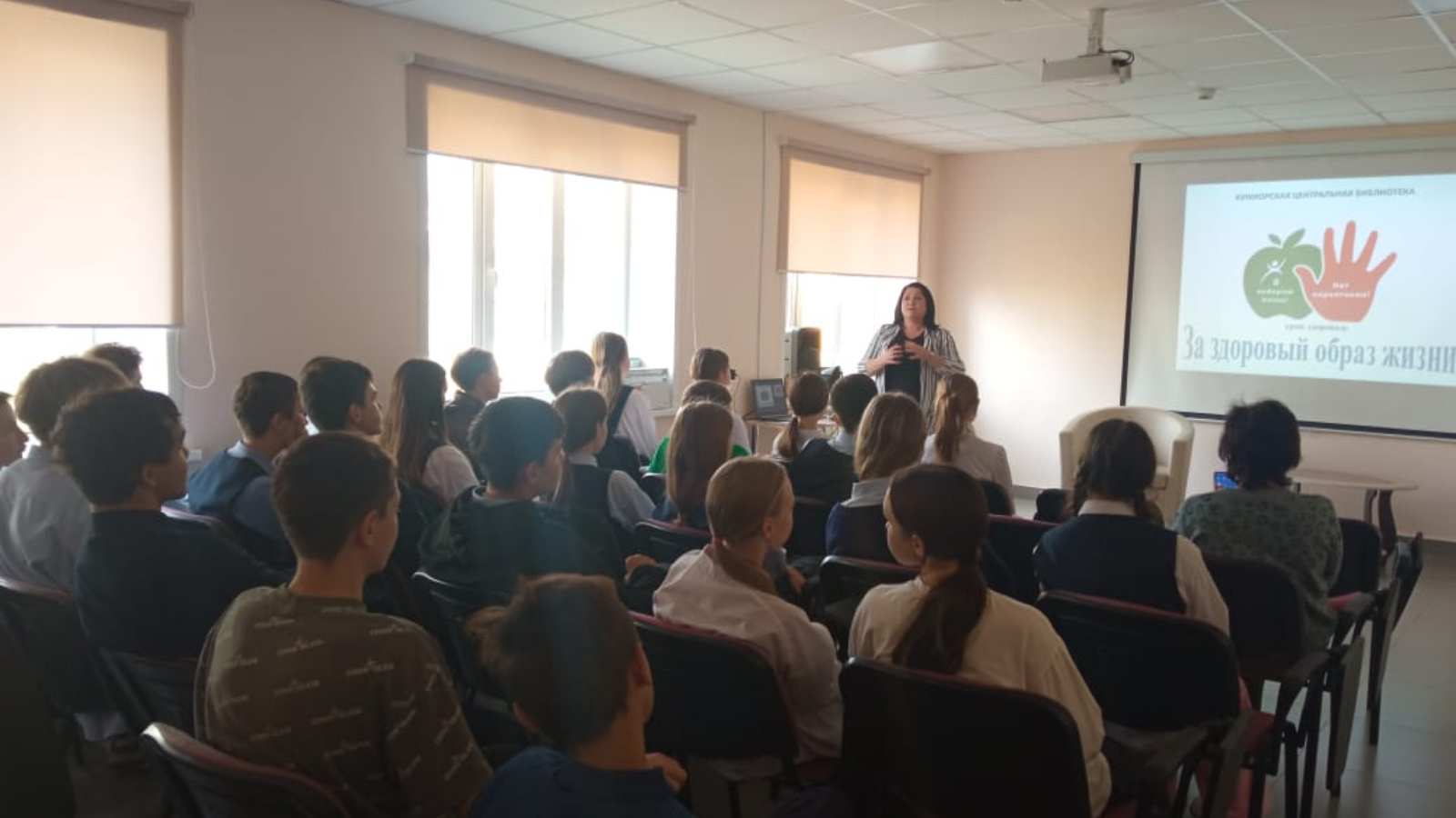 9 октябрь көнне хезмәт күрсәтү бүлеге китапханәчесе Гарипова Л.Д., 4 нче урта мәктәпнең 8 "А" сыйныфы укучылары өчен, "Сәламәт яшәү рәвеше өчен" дип исемләнгән сәламәтлек дәресе үткәрде. Игътибарны тәмәке тартуның, алкоголь һәм наркотиклар куллануның зыянына юнәлтүе, аларның организмга, бигрәк тә актив үсеш һәм үсеш чорында, җимергеч йогынтысы турында ассызыклады. Китапханәче начар гадәтләр белән бәйле авырулар турында статистик мәгълүматлар тәкъдим итте һәм яшүсмерләрне сәламәт яшәү рәвешен сайларга өндәде.