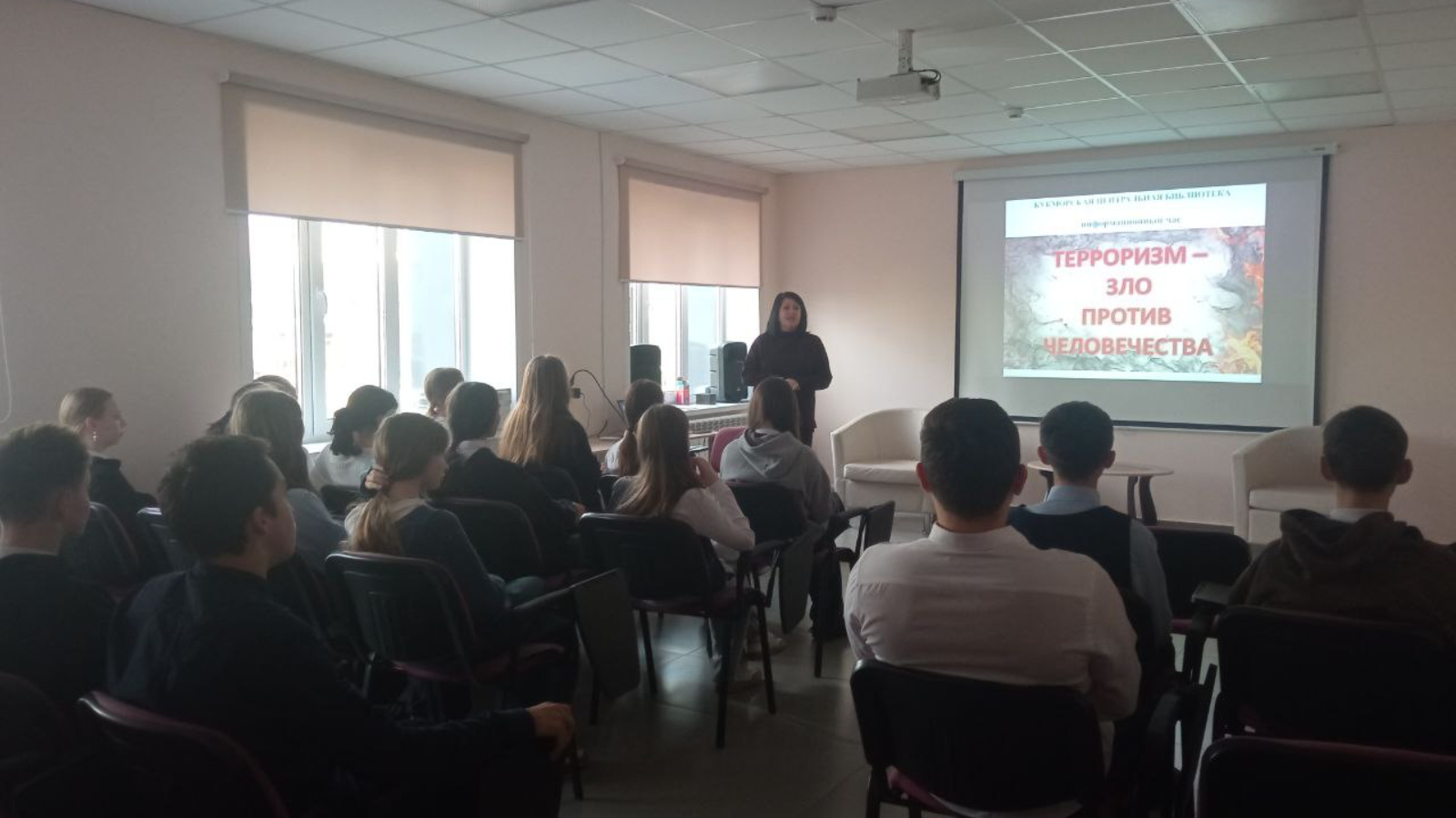 15 январь көнне хезмәт күрсәтү бүлеге китапханәчесе Гарипова Л.Д., 4нче урта мәктәпнең 8нче сыйныф укучылары өчен, «Терроризм - кешелеккә каршы явызлык» дигән әңгәмә үткәрде.