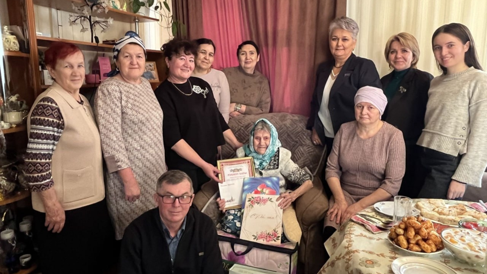 Юбилярны котларга район башлыгы урынбасары Резеда Гаянова, районның социаль яклау бүлеге җитәкчесе Регина Мусина, Янил авыл җирлеге башлыгының сәркатибе Әлфия Платонова, «Вахитов» җәмгыяте белгече Алсу Йосыпова килде. Кунаклар Минехәят апага район башлыгы Сергей Димитриев исеменнән Рәхмәт хаты һәм истәлек бүләге тапшырдылар, ихлас котлауларын җиткереп, нык сәламәтлек, күңел тынычлыгы, имин һәм бәхетле тормыш теләделәр.